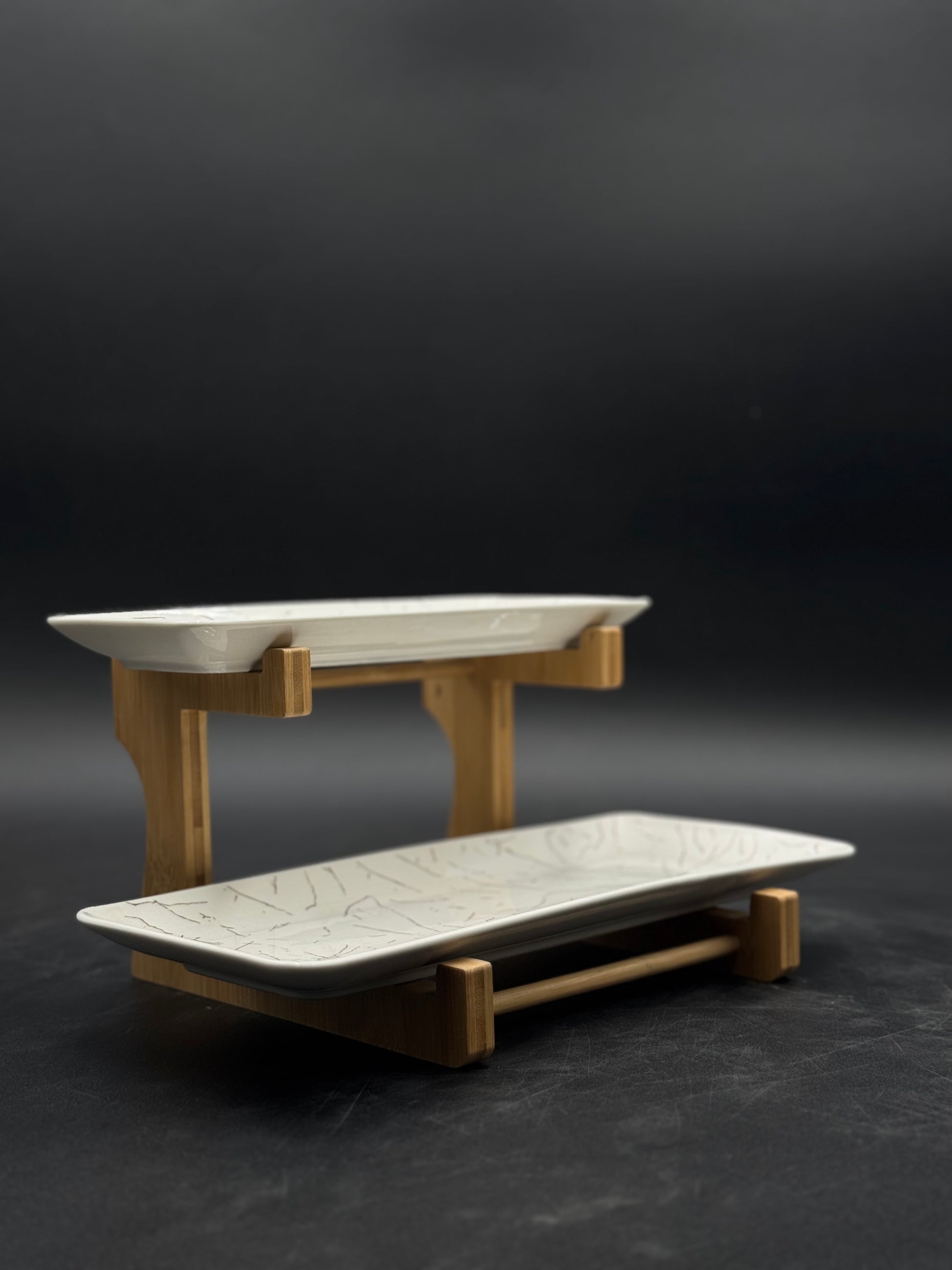 2 Tier Serving Tray Set features a stylish gold linework on white base✨