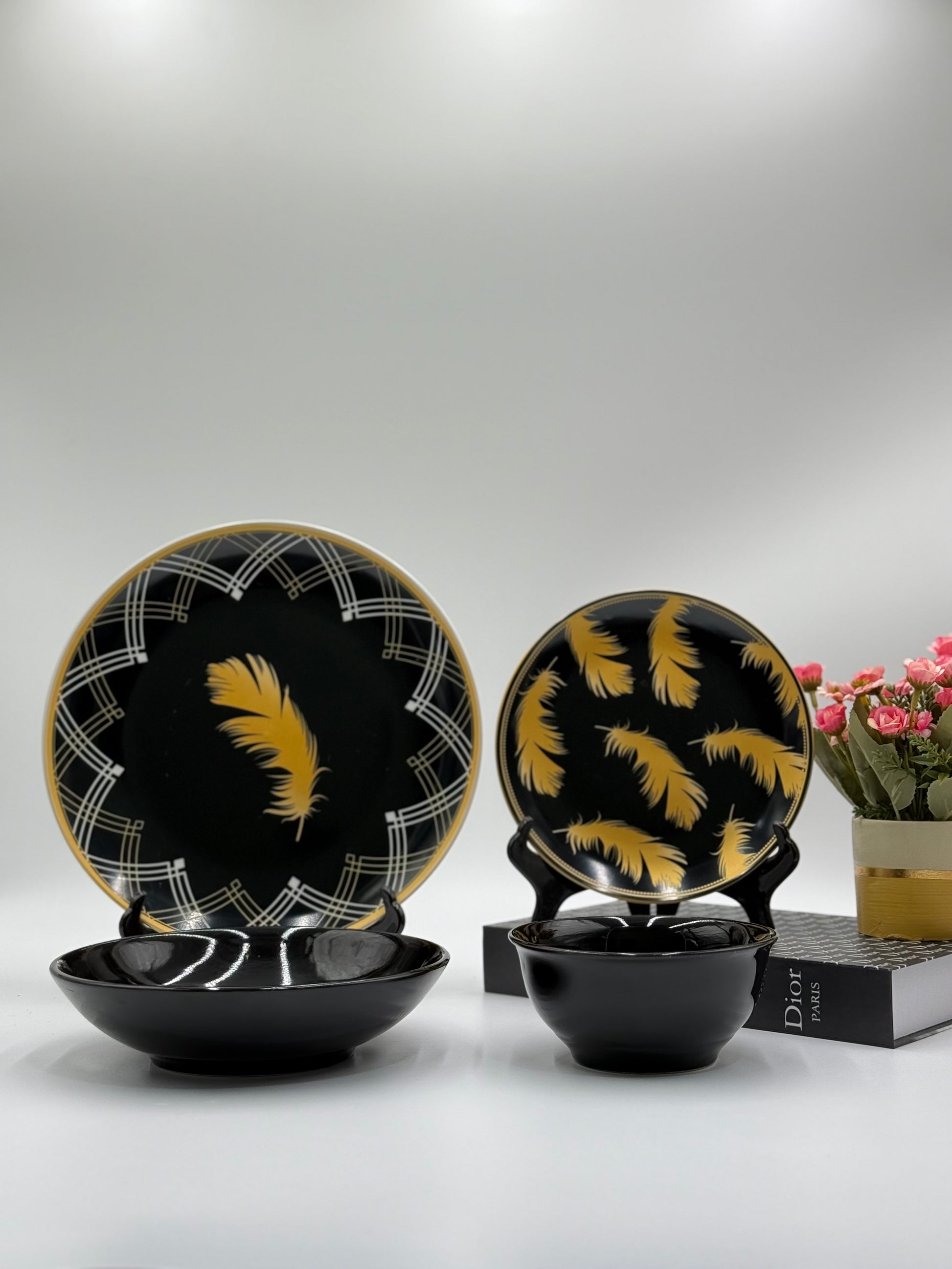 Introducing our elegant 24 Pcs Black Porcelain Dinner Set ✨, made in China and adorned with a luxurious golden feather design 🪶. This stylish set includes:
