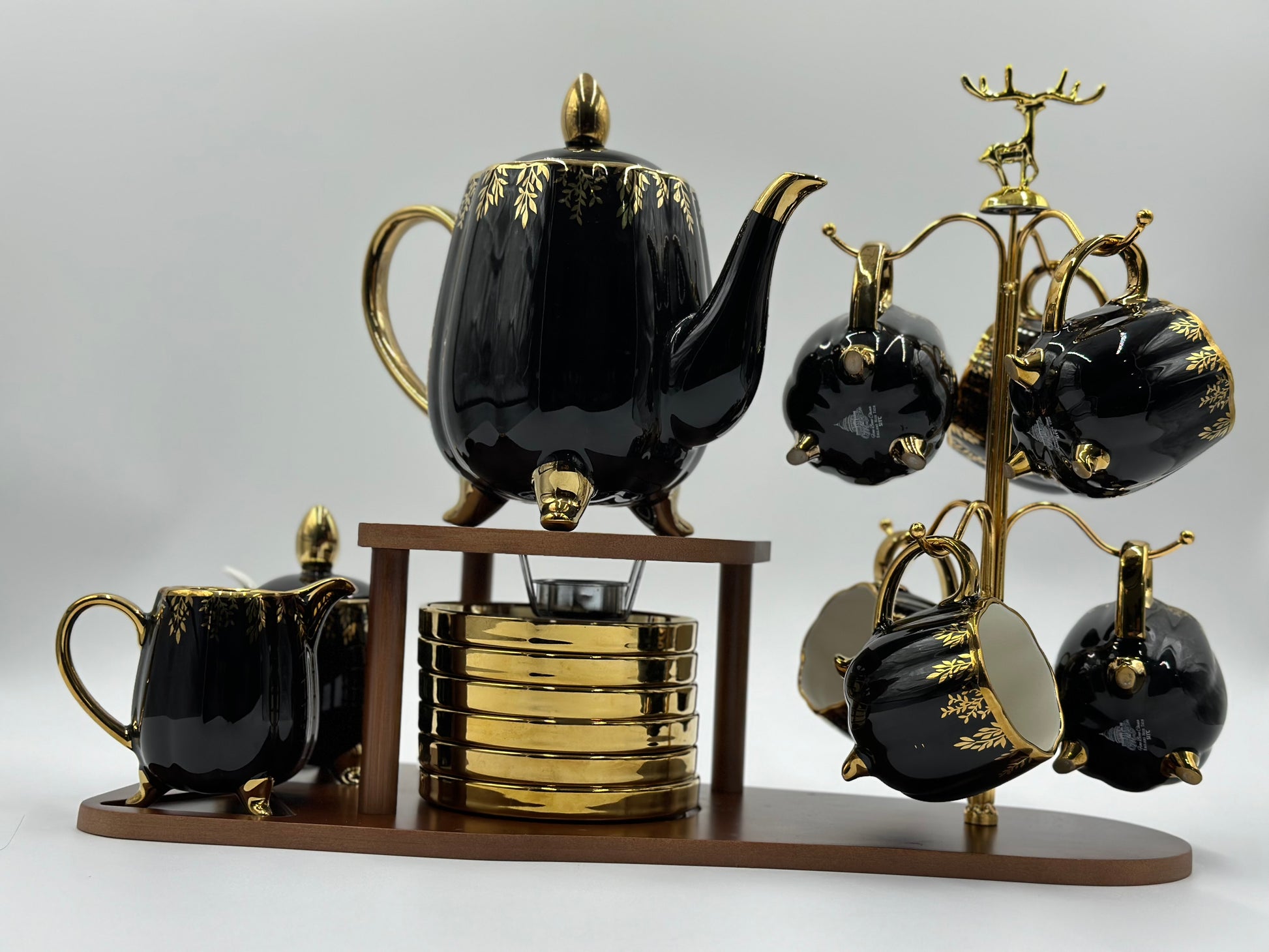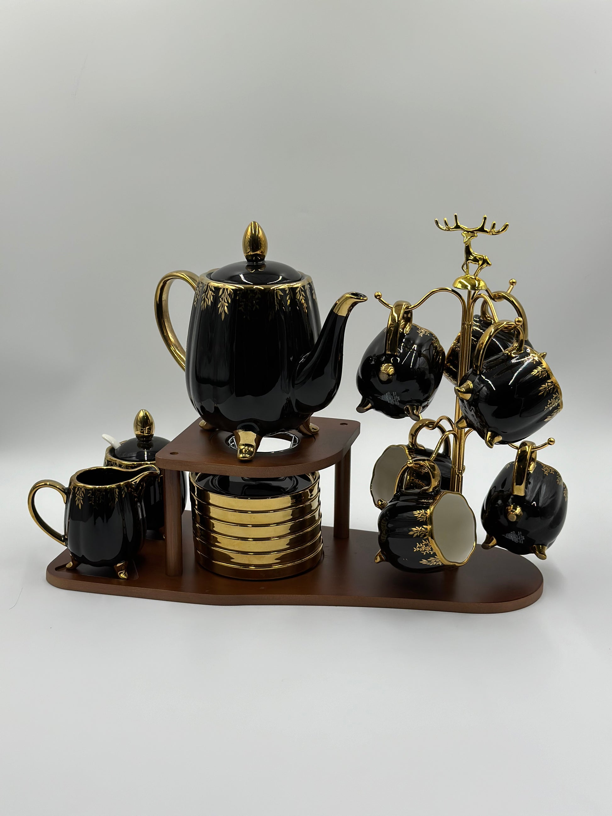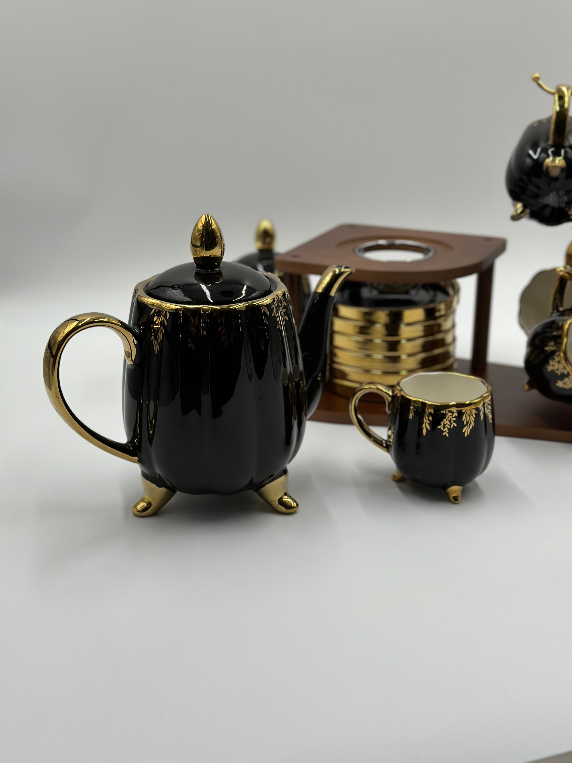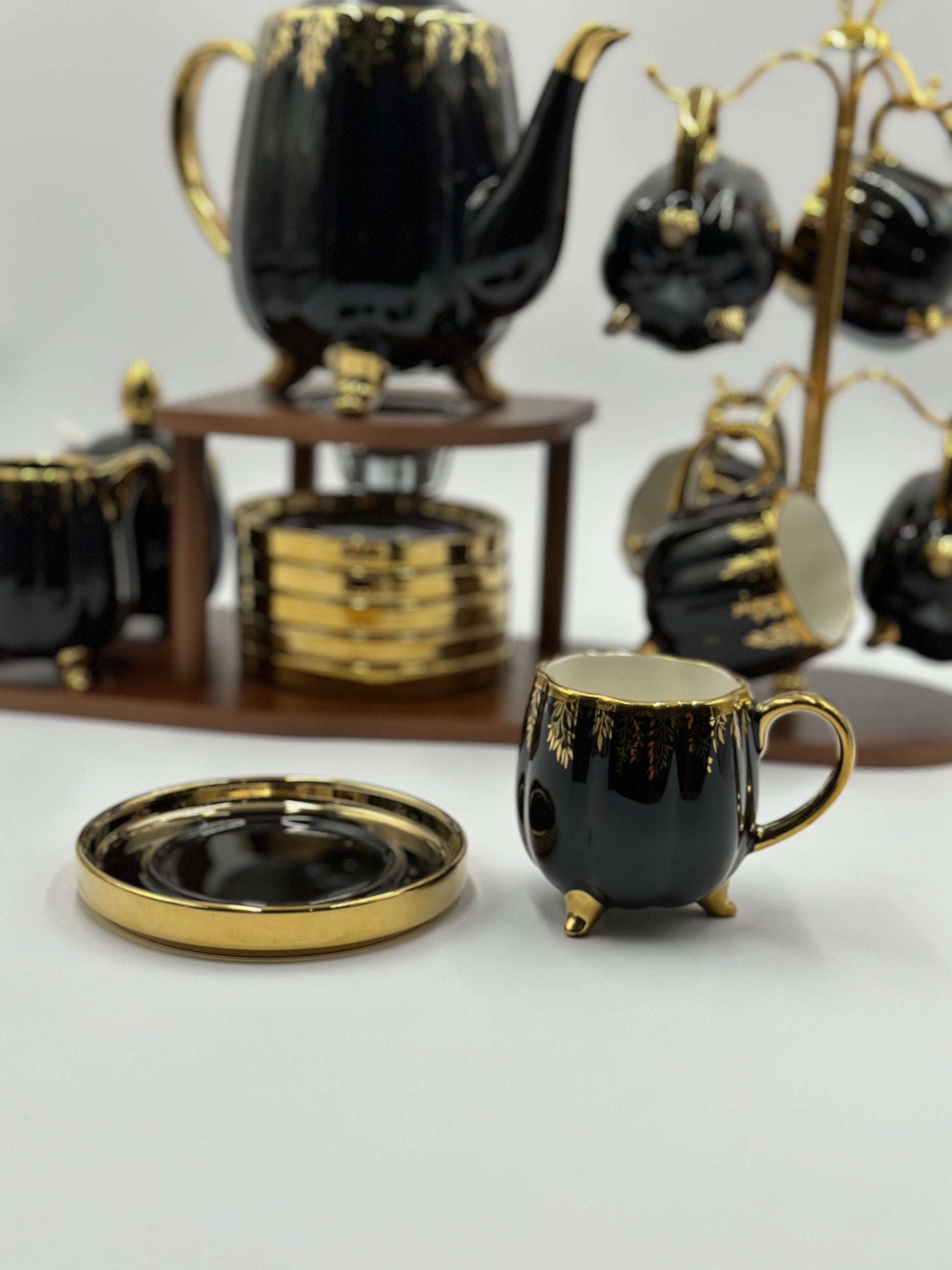 24K Gold Plated 20pcs Ceramic Tea Set with Wooden Stand