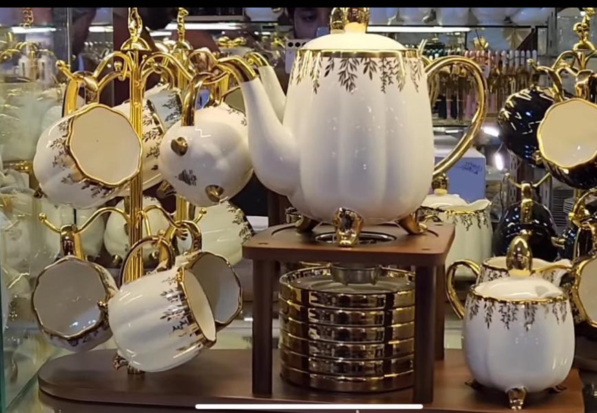 Indulge in luxury with our Elegant 24K Gold Plated 20pcs Ceramic Tea Set with Wooden Stand ✨. Crafted with premium quality ceramic and featuring the latest tea set design, this set is perfect for elevating your tea-time experience ☕.