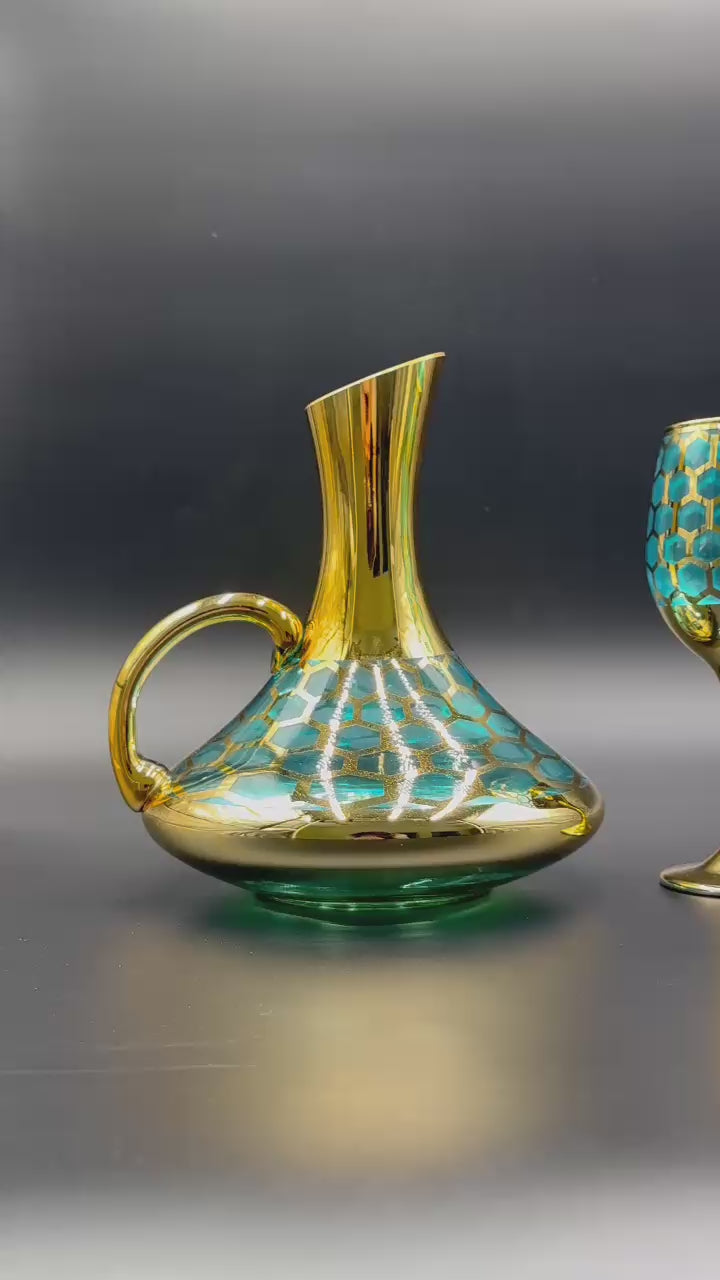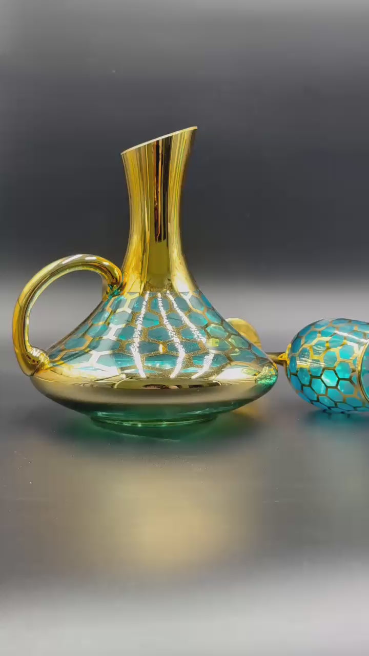 Elevate your table decor with this luxurious 24K Gold Plated 7-piece Turkish Blue Glass Water Set. Featuring intricate honeycomb patterns, the set includes 1 elegant jug and 6 wine glasses, blending sophistication with functionality.