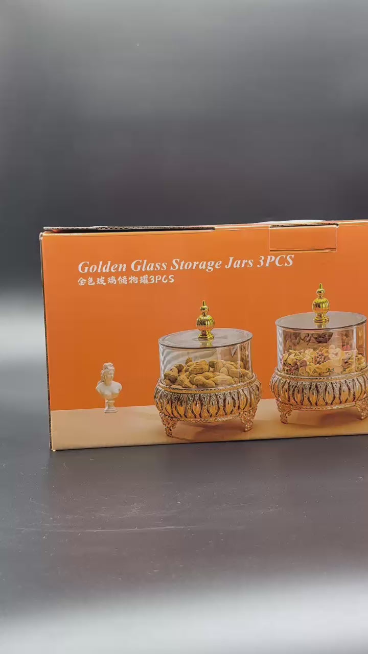 The Golden Glass Storage Jars Set includes three elegantly designed jars crafted from durable sodium-calcium glass, featuring intricate golden bases and lids, perfect for adding a luxurious touch to your storage needs. ✨