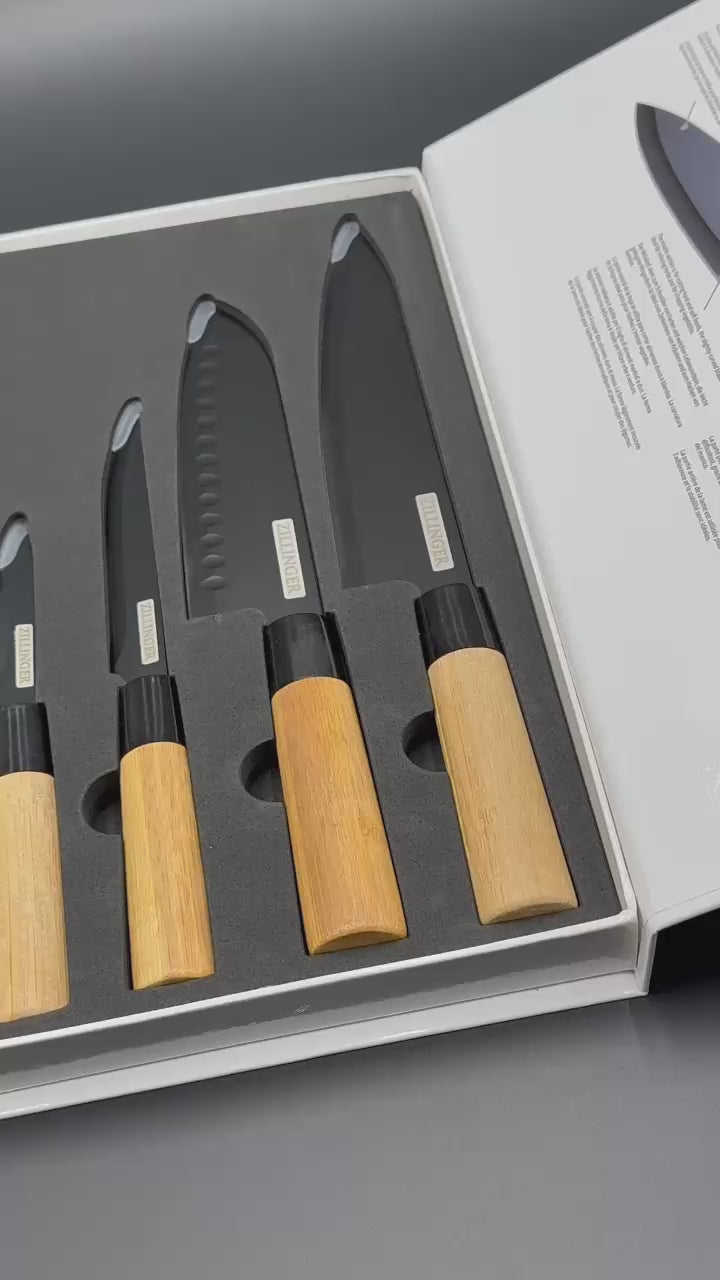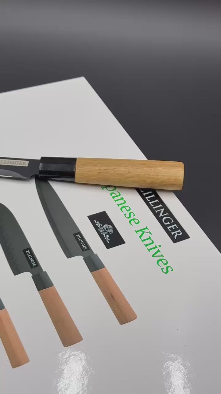 Upgrade your kitchen with the 4 Pcs Japanese Premium Knife Set ✨. Designed with sleek black blades and ergonomic wooden handles, this set offers precision cutting with a stylish touch. Perfect for chefs and home cooks alike, it brings both functionality and elegance to your culinary experience!✨