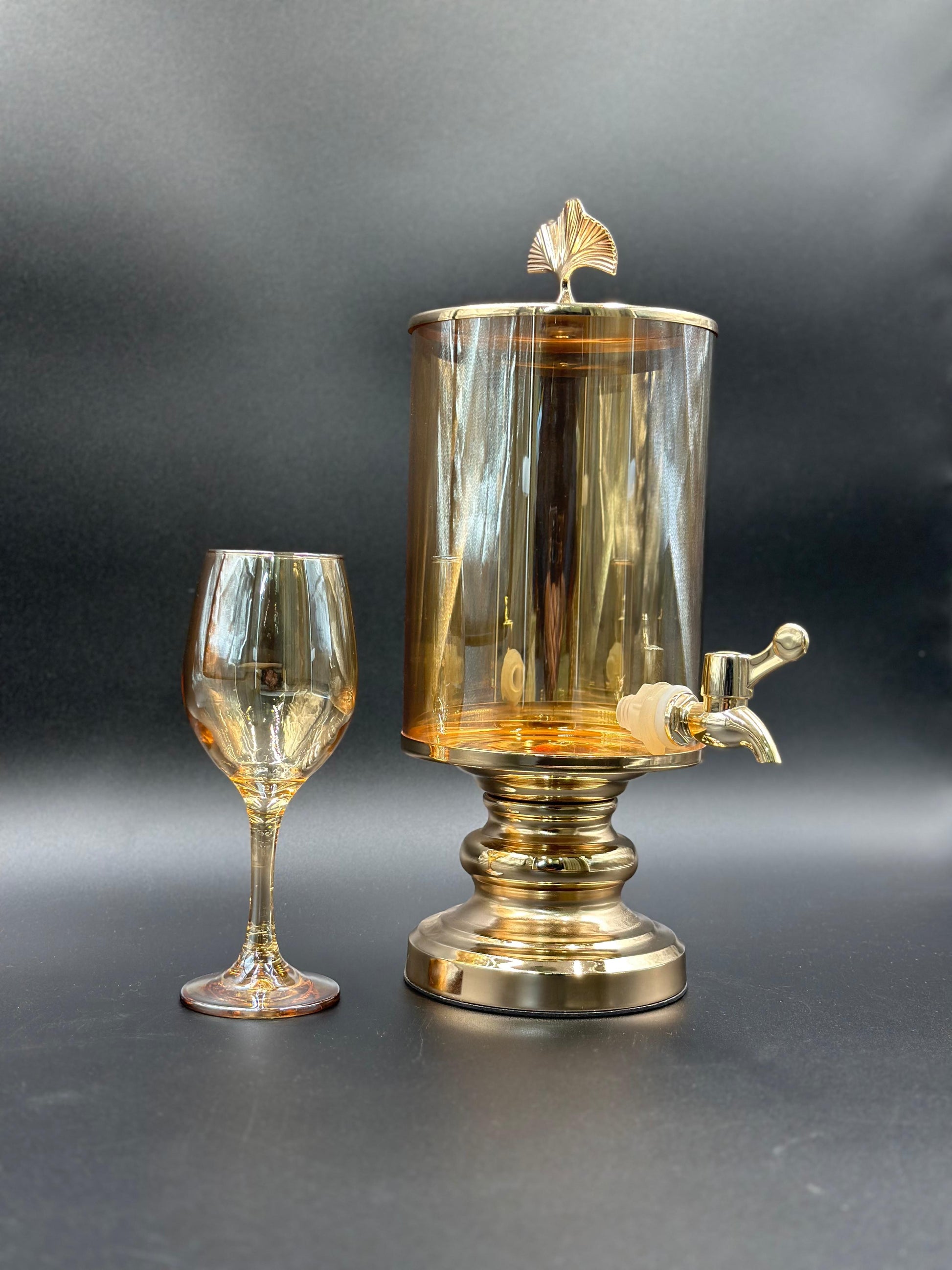 The set includes 1 Dispenser with Metal Base and 6 Wine Glass.