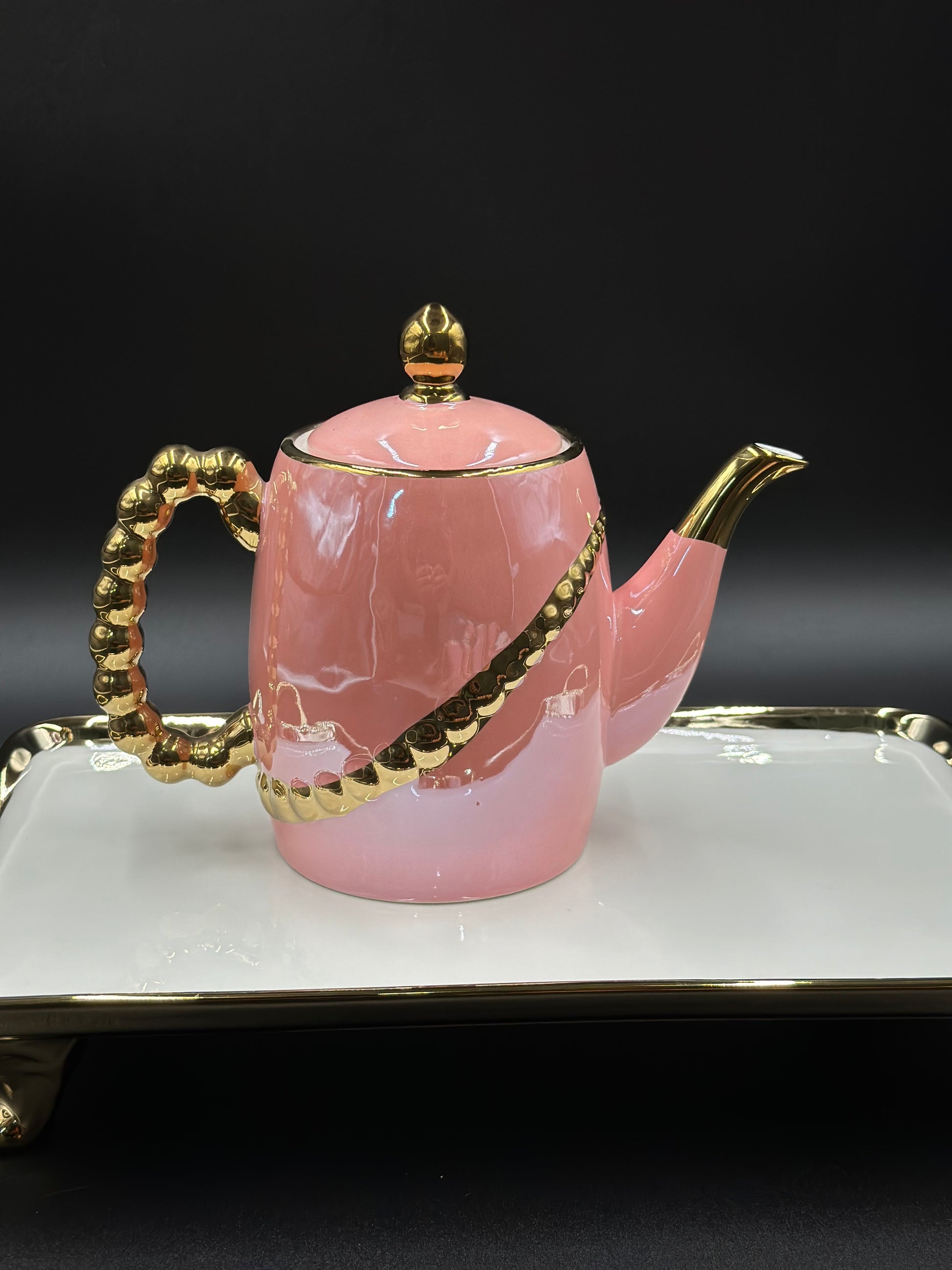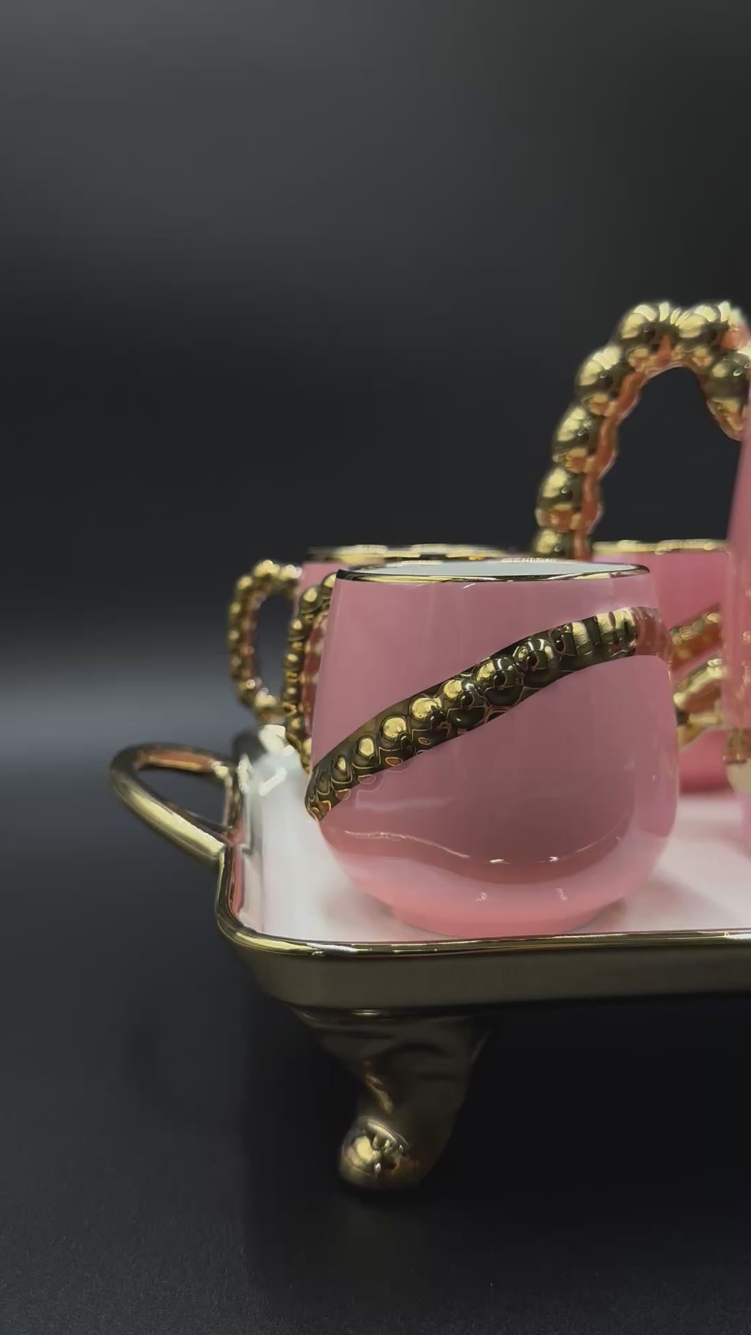 The 8 pcs tea set features elegant 24K gold diagonal spiral giving a royal look on a pure coloured base ✨