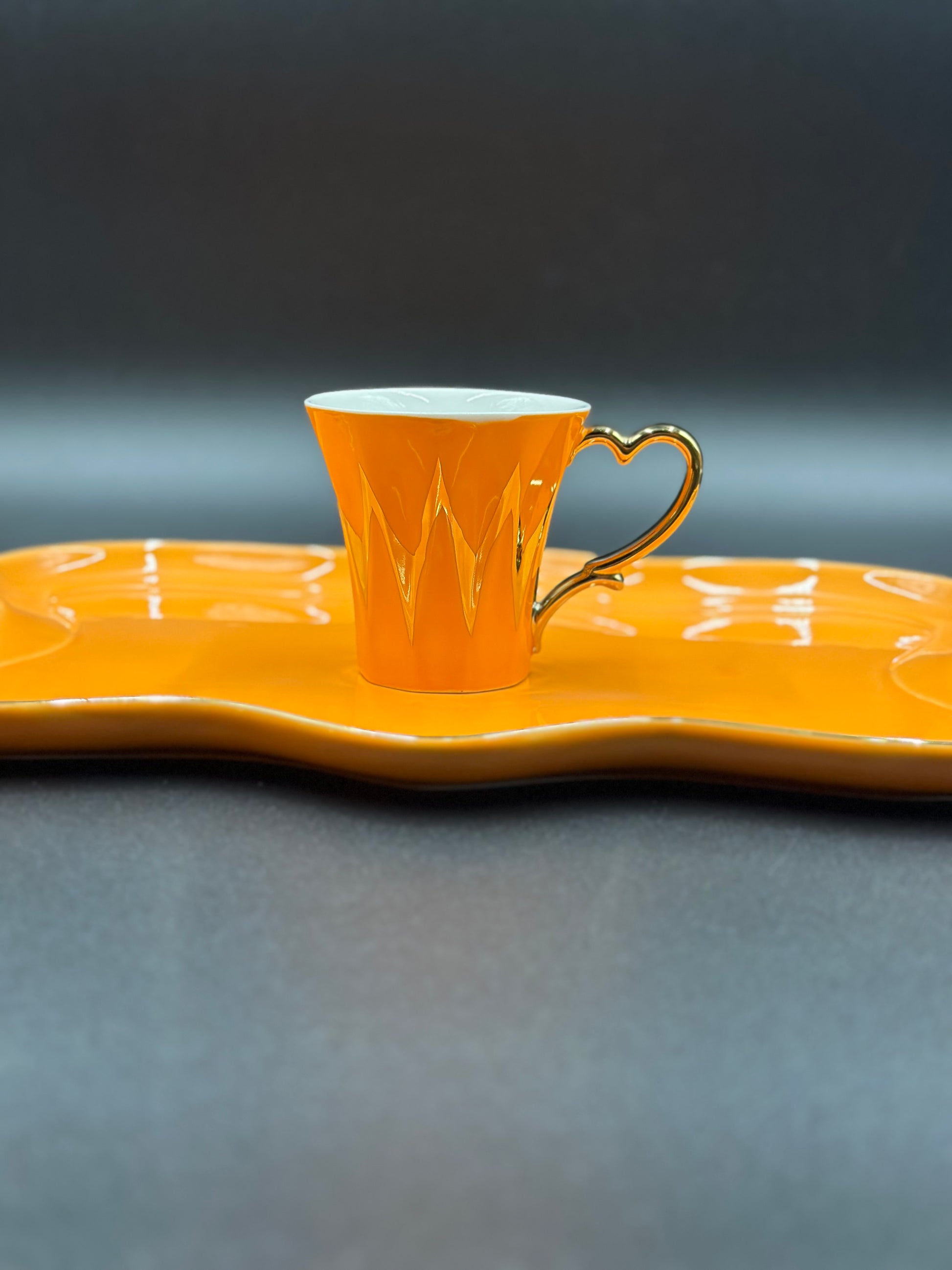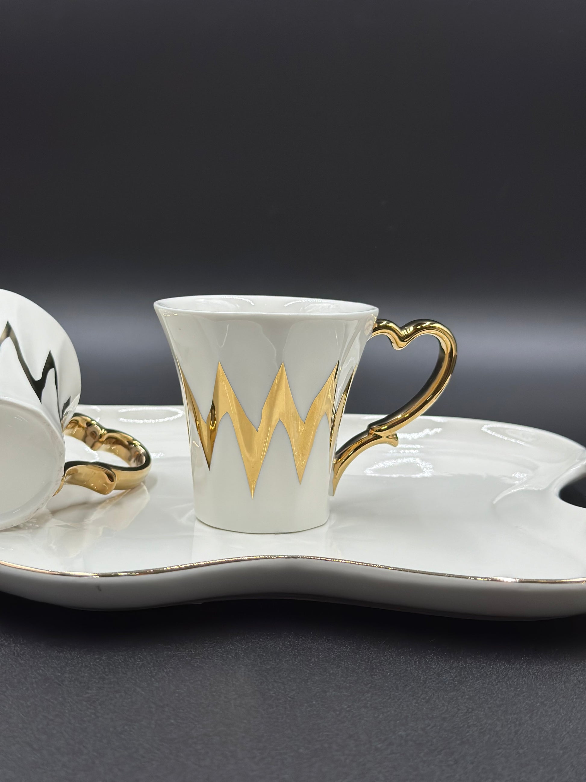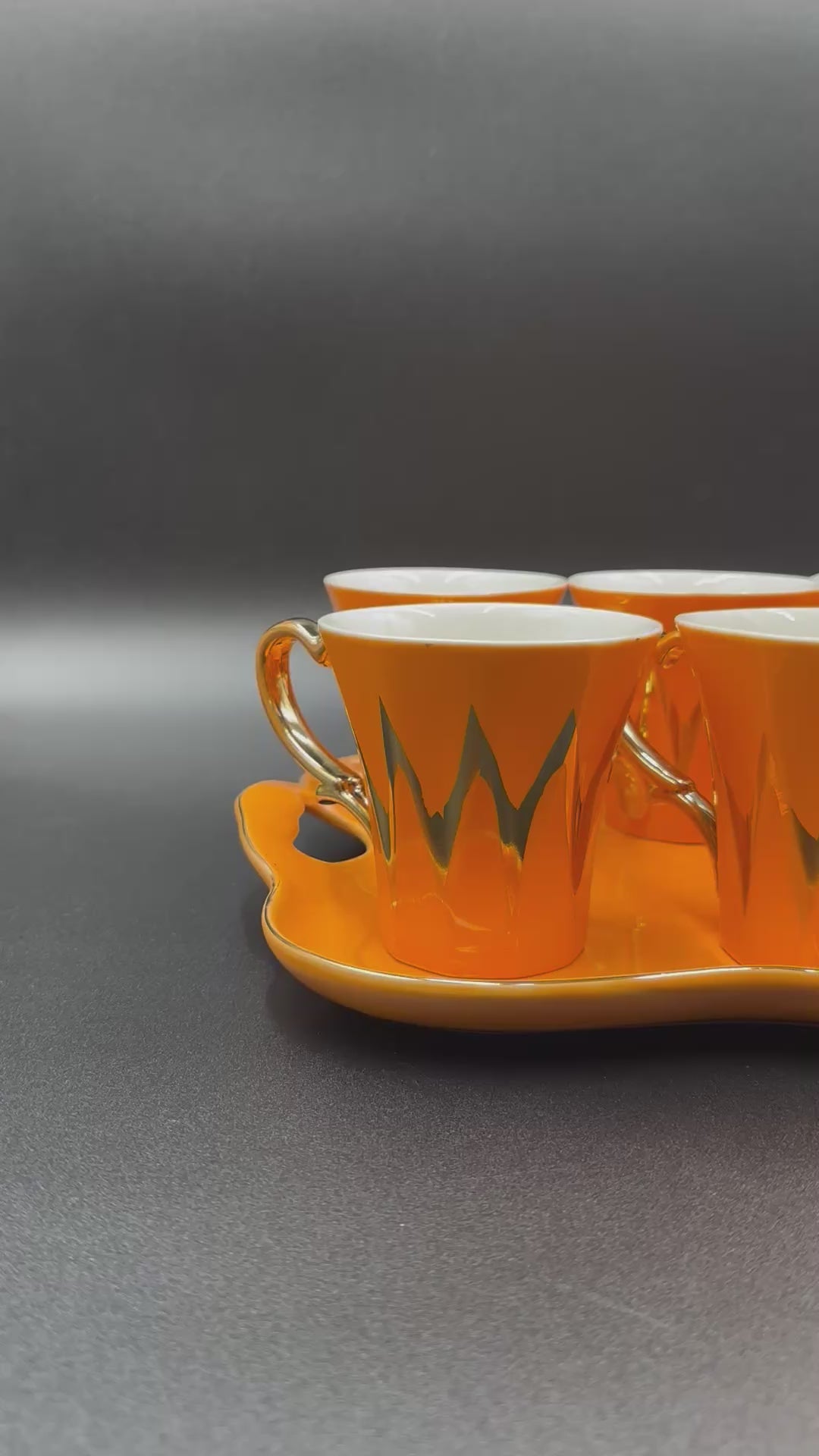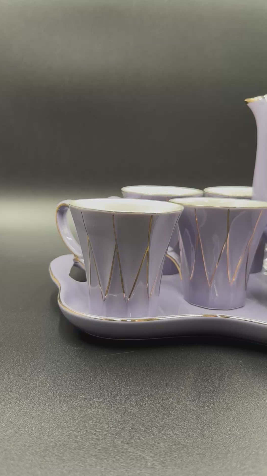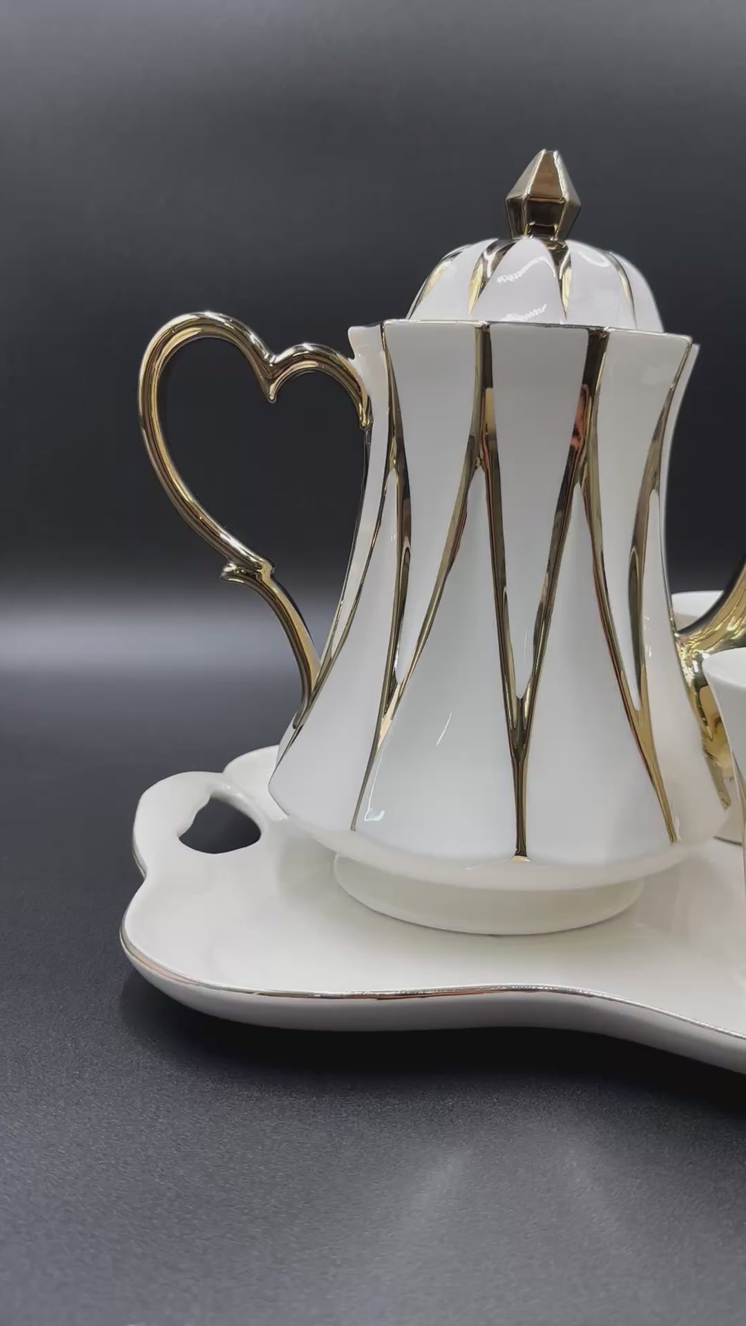 The 8 pcs tea set features elegant 24K gold accents, highlighted by sleek, vertical gold streaks that resemble the grandeur of a royal crown, against a pure coloured base ✨.