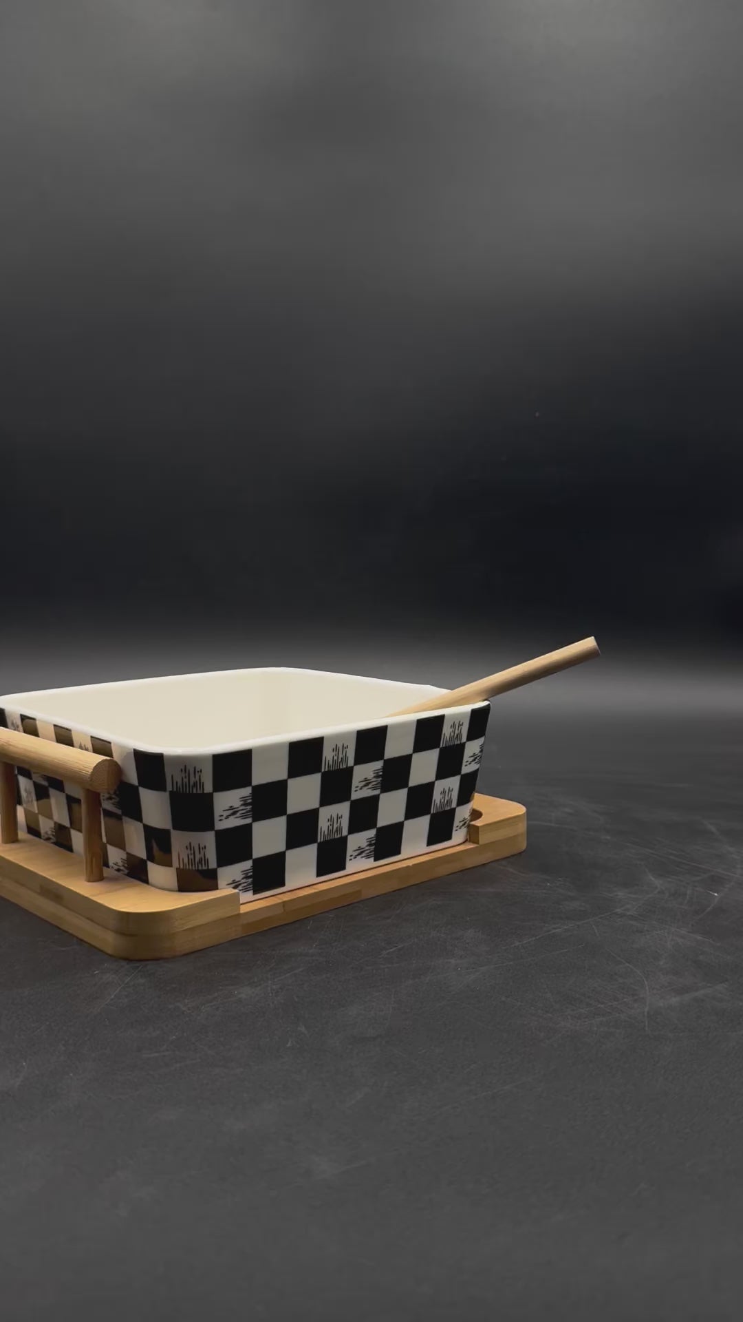 Serving Bowl with Bamboo Spoon,Fork and Stand features a sleek black and white box pattern serving vijg bowl with a modern, urban flair ✨