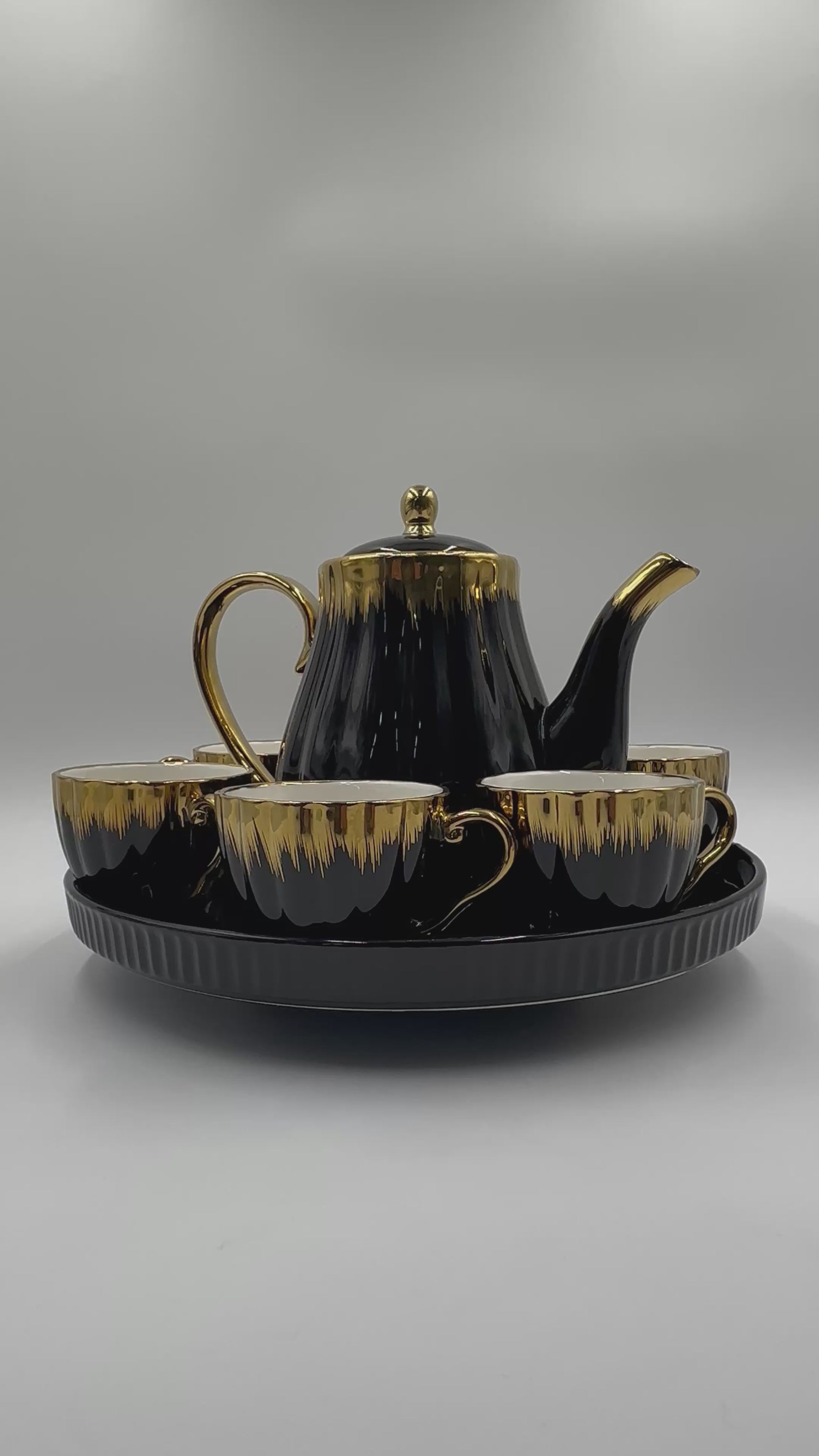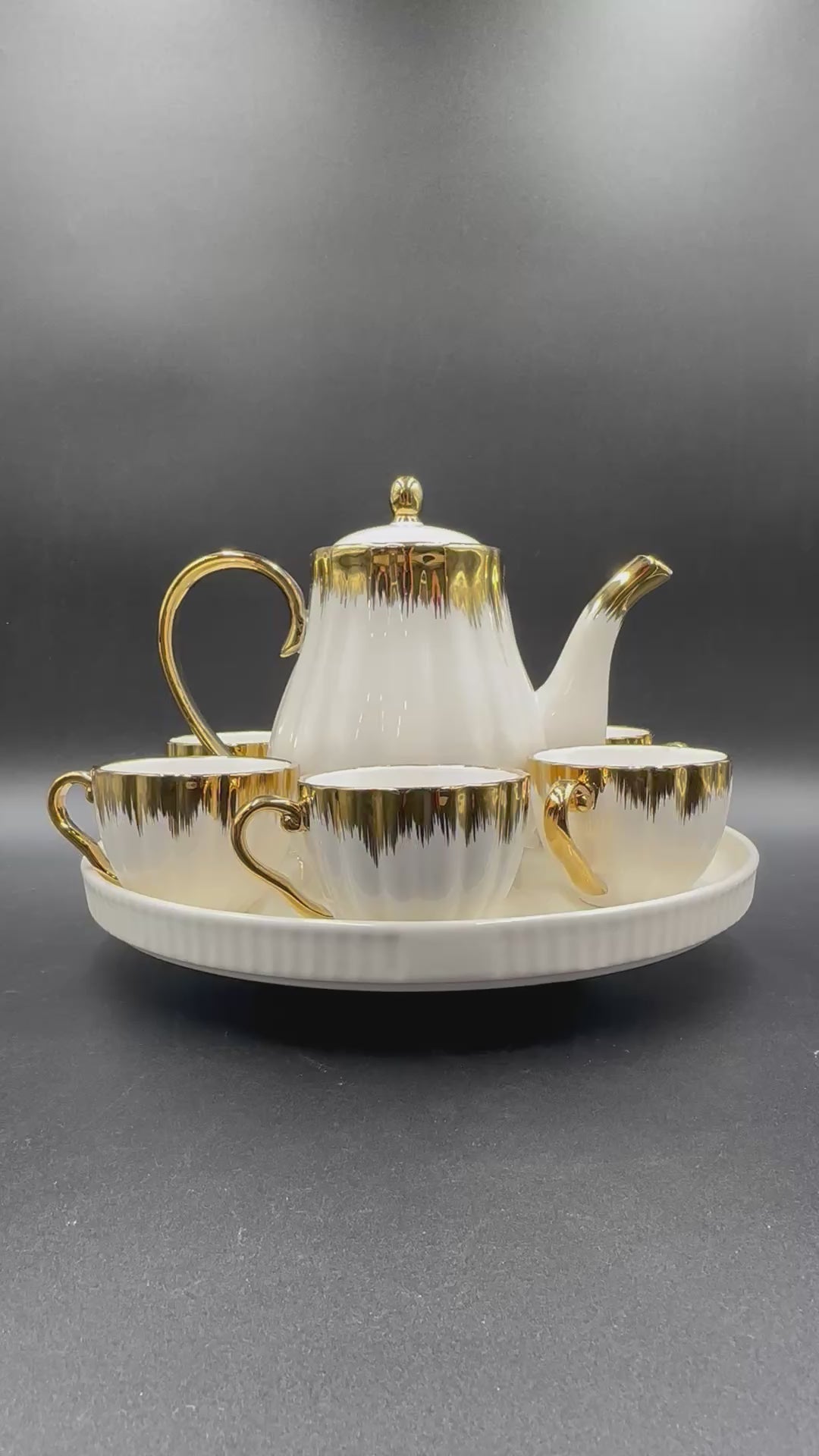 Golden Rim 8 Pcs Tea Set with Rotating Tray features a luxurious gold swirl design paired with a functional rotating tray for effortless serving. Perfect for adding elegance to your tea gatherings!