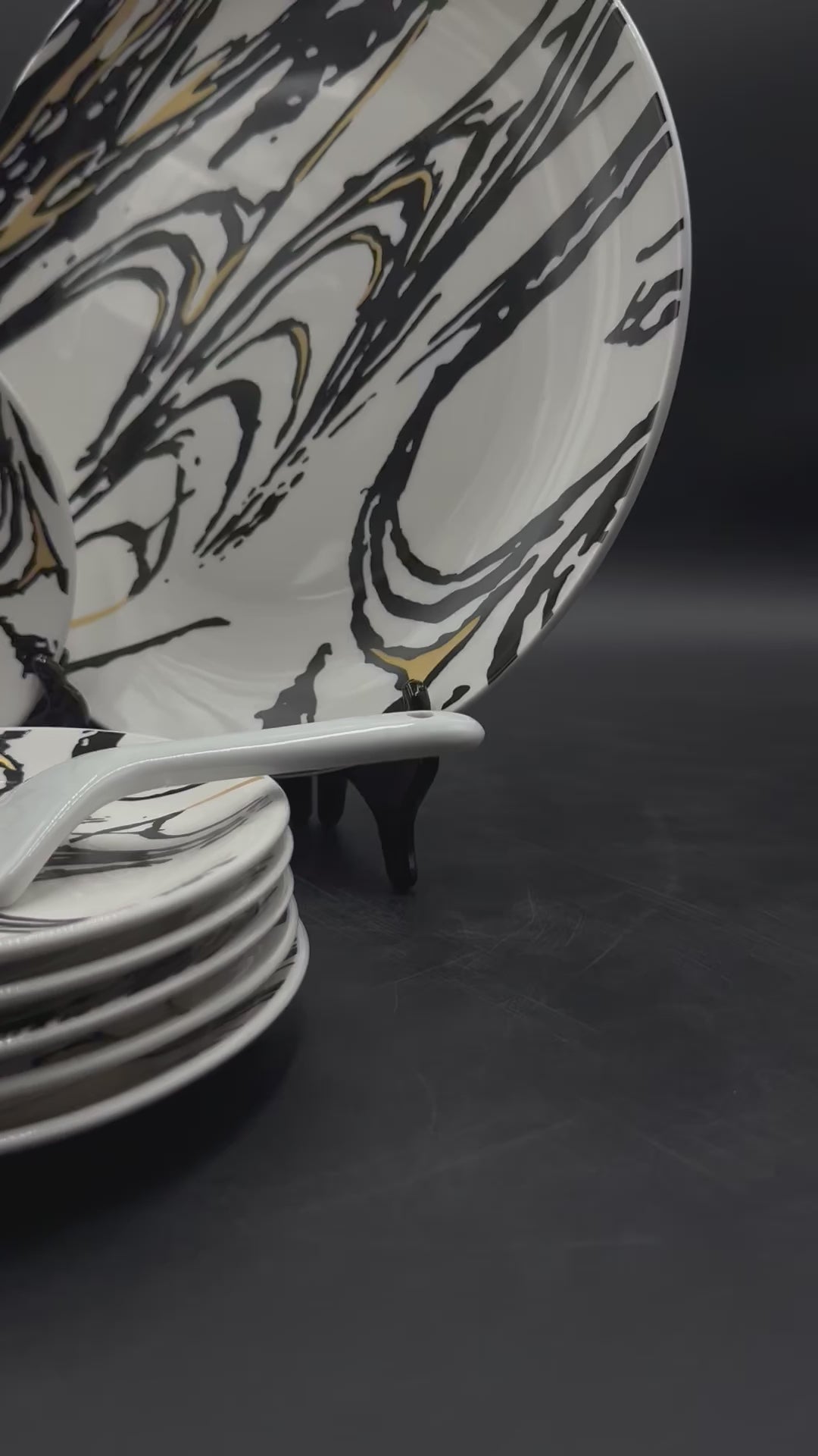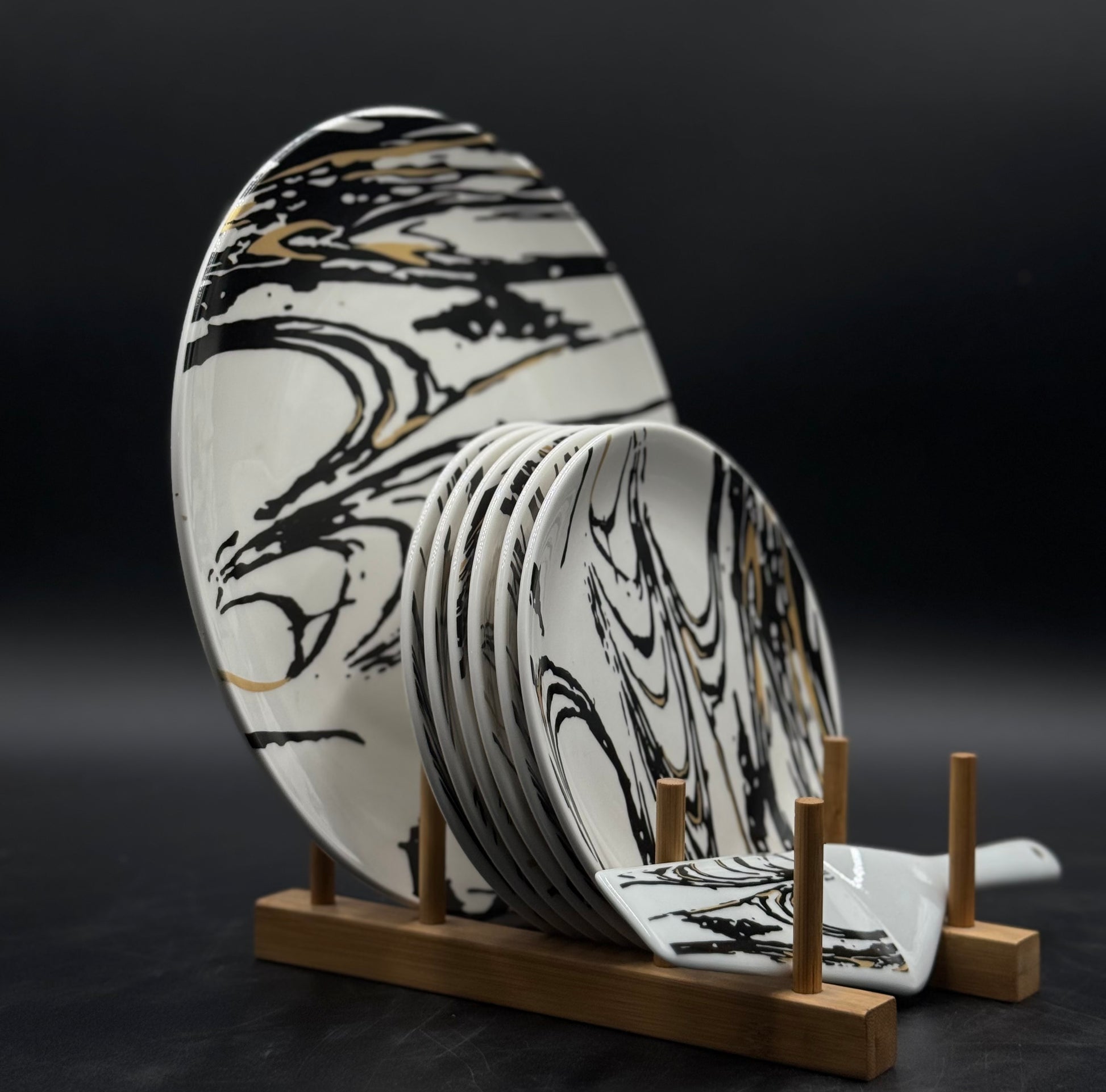 The 9pcs Marble Cake Set features a sleek black and white abstract pattern with a modern and urban style 🎂✨