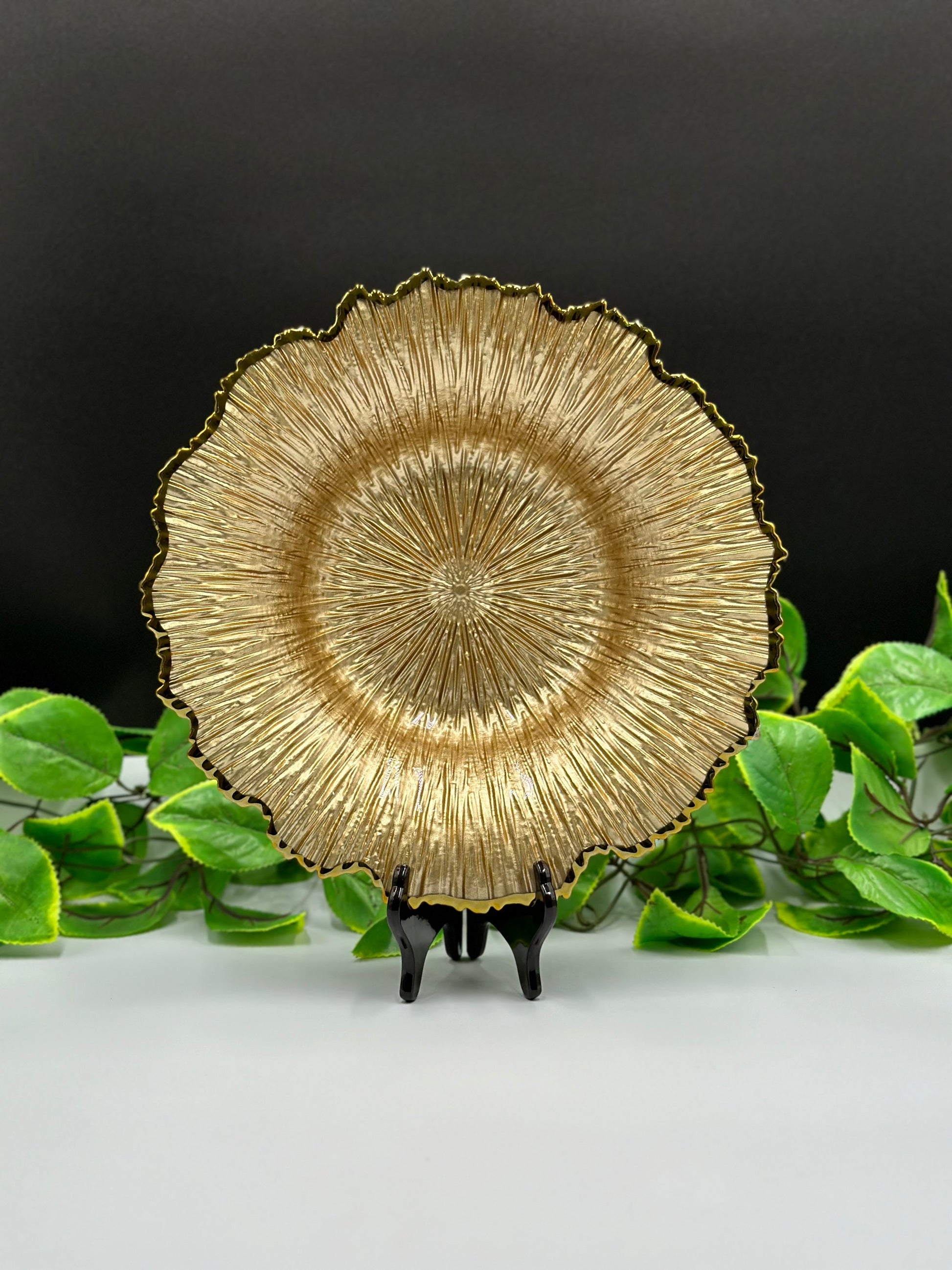 The Turkish Golden Glass Flower Shaped Platter features a stunning iridescent finish with Delicate Gold Rims. ✨🥣